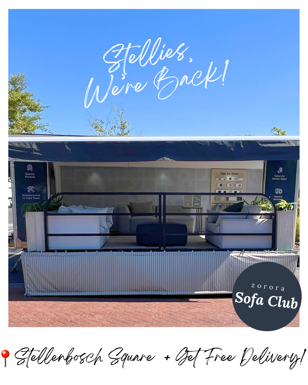 The Zorora Sofa Club mobile showroom is once again at Stellenbosch Square, next to We Buy Cars near the Woolworths entrance!